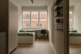 På bygningens syv øvre etager etableres tre boligstørrelser, alle omkring varierende typer fællesrum.